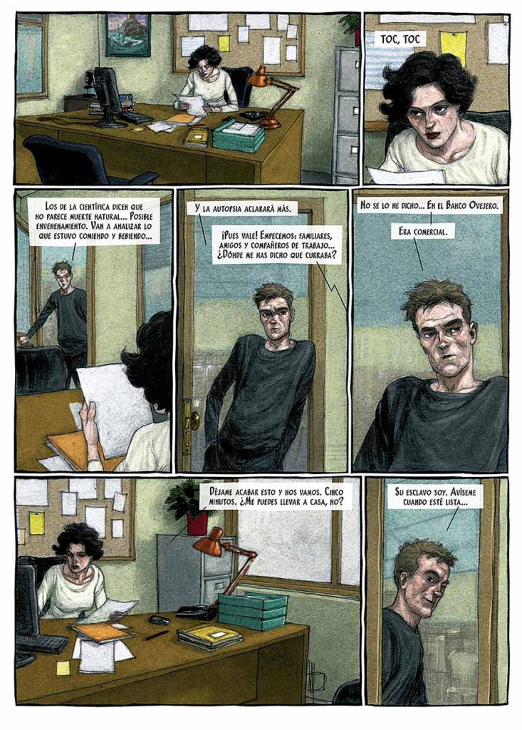 A primeira aventura saiu em 2016 na Espanha – tenho a edição portuguesa, e trata-se da investigação de uma série de assassinatos. Uma história triste e que envolve uma importante crítica social. A segunda HQ (e, por enquanto, a última) foi publicada oito anos depois – é bem recente, portanto – e aborda uma lamentável rede de pornografia.