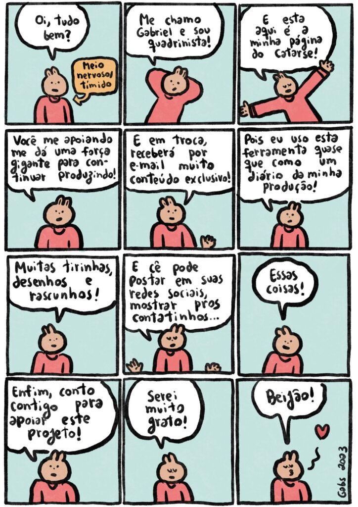 Graças a vocês assinantes eu fui capaz de produzir a webcomic Arlindo. A história de um menino do interior – cheio de sonhos, dúvidas e vontade de achar seu lugar no mundo enquanto vai encontrando sentido para canções de Sandy & Junior pelo caminho. Publicada entre 2019 e 2020 gratuitamente no Twitter, em 2021 a HQ ganhou sua versão física pela Editora Seguinte depois de uma campanha recordista também aqui do Catarse – Arlindo encontrou abrigo em casas e bibliotecas pelo Brasil inteiro e me faz muito feliz pensar que as pessoas se sentiram menos sozinhas ao encontrarem com ele também.