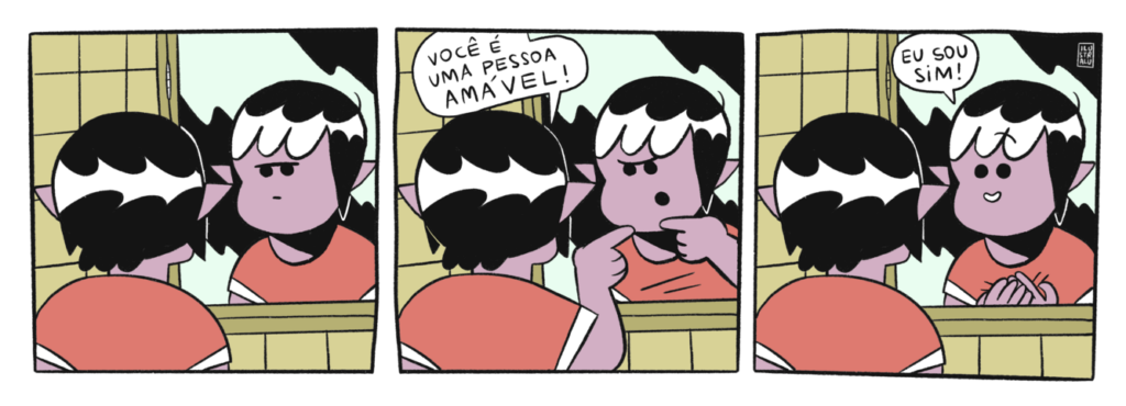 “Ok, primeiro, deixa eu me apresentar! Eu sou Luiza de Souza, as pessoas na internet costumam me conhecer como @ilustralu! Trabalho com ilustração, invento quadrinhos e gosto de pensar que quando a gente conta histórias que a gente sempre quis ler – de coração, o mundo fica um bucadinho melhor. Eu gosto de ilustrar e escrever sobre relacionamentos, sobre cotidiano, sobre cidades, mas – principalmente, sobre pessoas e os universos que existem dentro e ao redor de todas elas.