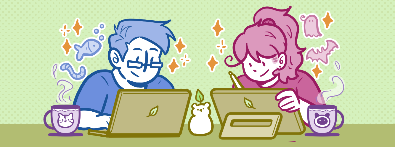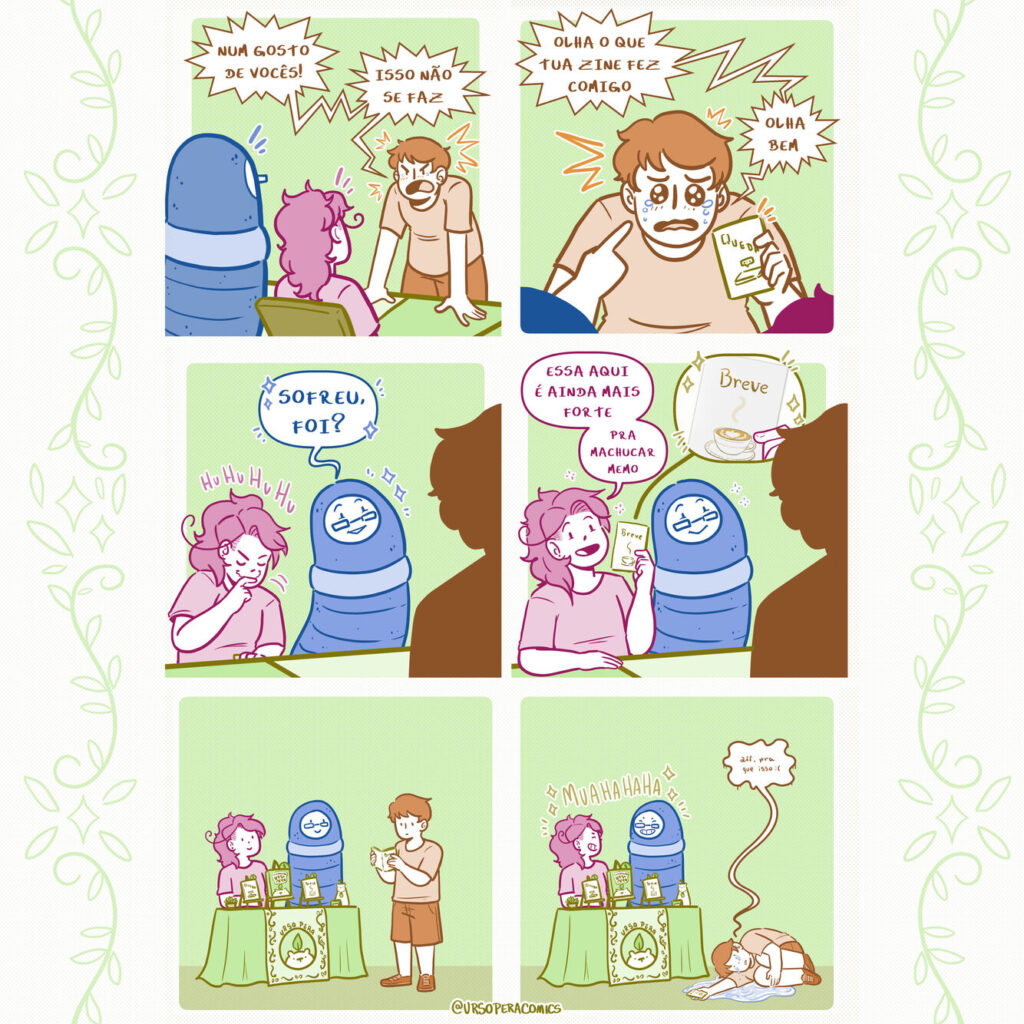 “Oi! Nós somos Kami e Lulis, e somos a dupla Urso Pera. Fazemos tirinhas meio autobiográficas para as redes sociais desde Junho de 2018, usando como base a nossa convivência e adicionando aqui e ali uns toques de fantasia e insanidade. Em 2024, nossas tirinhas foram compiladas em um grande livrão, o ComPERAdão Urso Pera, do qual temos muito orgulho. Também temos duas zines experimentais que, modéstia à parte, são muito boas.”